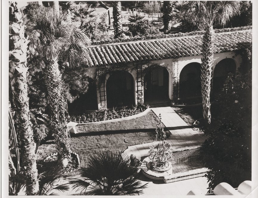 El Vernadero included 15 rooms around a courtyard with a fountain. To the east of the breezeway was the living room, to the west was the guest bedroom and the Cookes’ bedrooms, the north wing comprised the dining room, kitchen and billiard room. There were smaller rooms for servants, a chauffeur, storage for travel trunks and a laundry room. The covered walkway around the courtyard was interspersed with archways that gave views of the lushly planted courtyard and the tiled, Moorish-influenced reflecting pool.